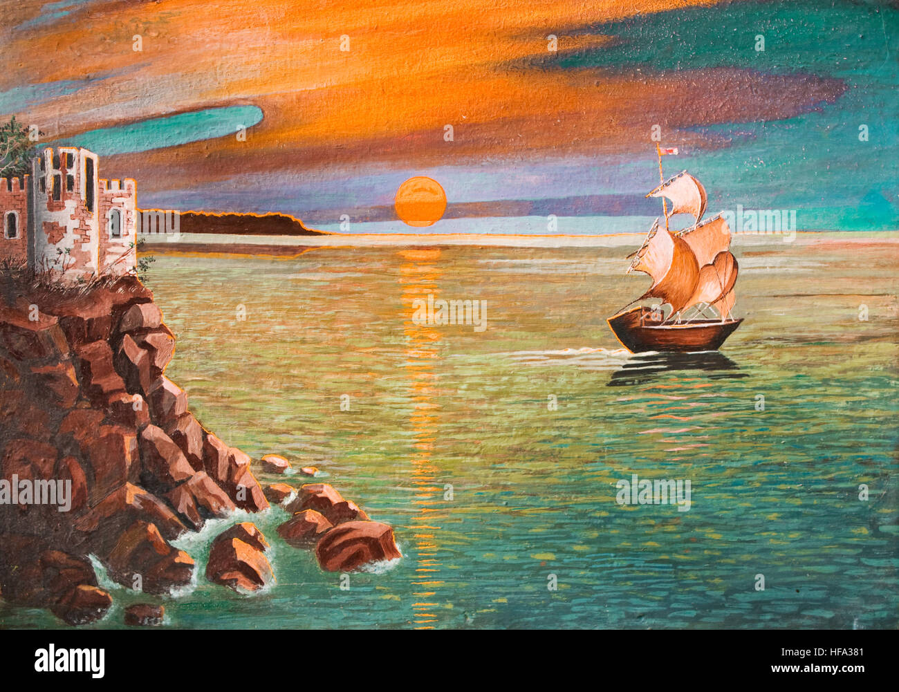 Ma propre photo, peinture à l'huile. Paysage avec la mer et bateau à voile à château sur rock, le coucher du soleil Photo Stock - Alamy