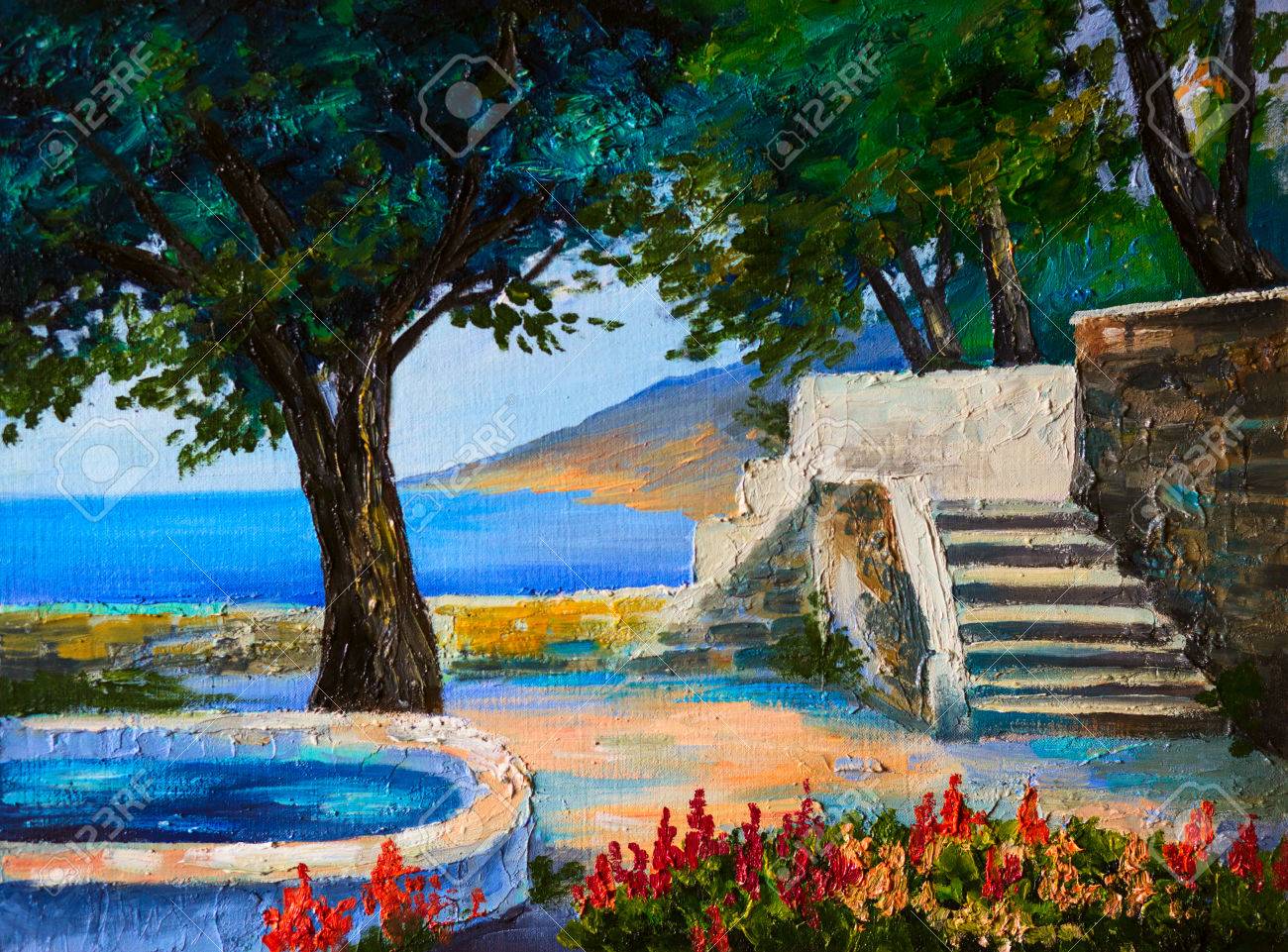 Peinture à L'huile Paysage - Terrasse Près De La Mer, Des Fleurs Banque D'Images Et Photos Libres De Droits. Image 38222994.