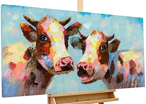KunstLoft® Peinture Acrylique sur Toile Bavardages animaliers 120x60cm Toile sur Cadre en Bois Vache Multicolore Bleu Animal Multicolore Tableau Acrylique Peint à la Main Cuisine et Maison Tableaux, posters et arts décoratifs