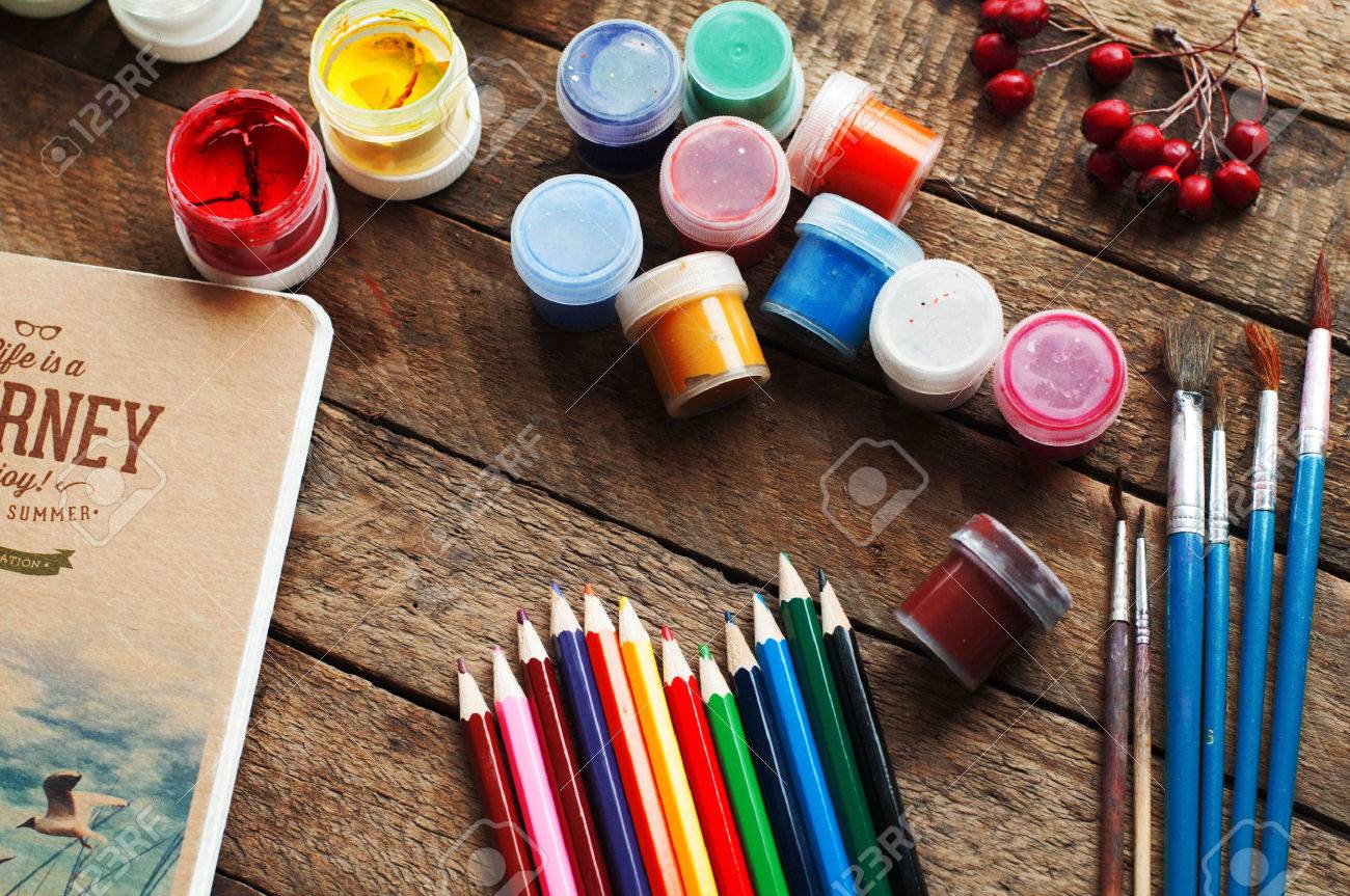 Art De La Peinture. Peindre Seaux Sur Fond De Bois. Différentes Couleurs De Peinture Peinture Sur Fond De Bois. Peinture Jeu: Pinceaux, Peintures, Crayons, Craie, Aquarelle, Peinture Acrylique Sur Un Fond En